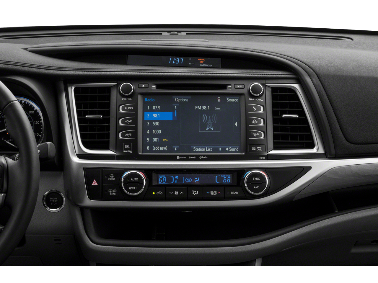 • Radio: Entune Premium JBL Audio w/Nav & App Suite -inc: the Entune Multimedia Bundle (8" high resolution touch-screen w/split screen display, AM/FM CD player, MP3/WMA playback capability, 12 JBL GreenEdge speakers, auxiliary audio jack, USB 2.0 port w/iPod connectivity and control, advanced voice recognition, hands-free phone capability, phone book access and music streaming via Bluetooth® wireless technology), Siri Eyes Free, Entune App Suite, Intelligent Touch controls, SiriusXM Satellite Radio w/3-month complimentary SiriusXM All Access trial, HD Radio, HD Radio predictive traffic and Doppler weather overlay, AM/FM cache radio, Gracenotes album cover art and integrated backup camera display w/dynamic gridlines